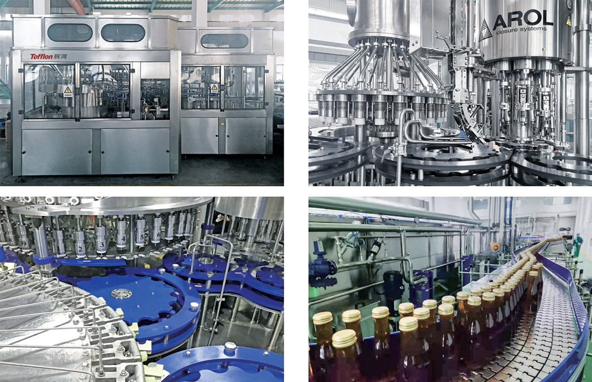 卸瓶機、洗瓶機、洗-灌-封主機、凈化、上蓋、理蓋、溫瓶/噴淋、實瓶輸送、貼標機、裝箱/裹包、碼垛、電氣控制、工程設計和施工等。